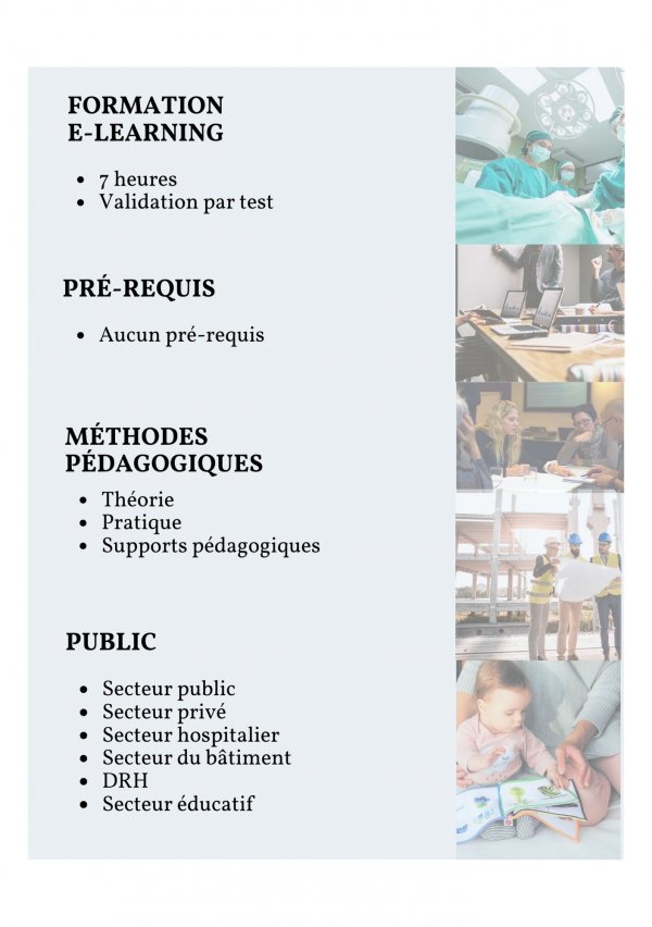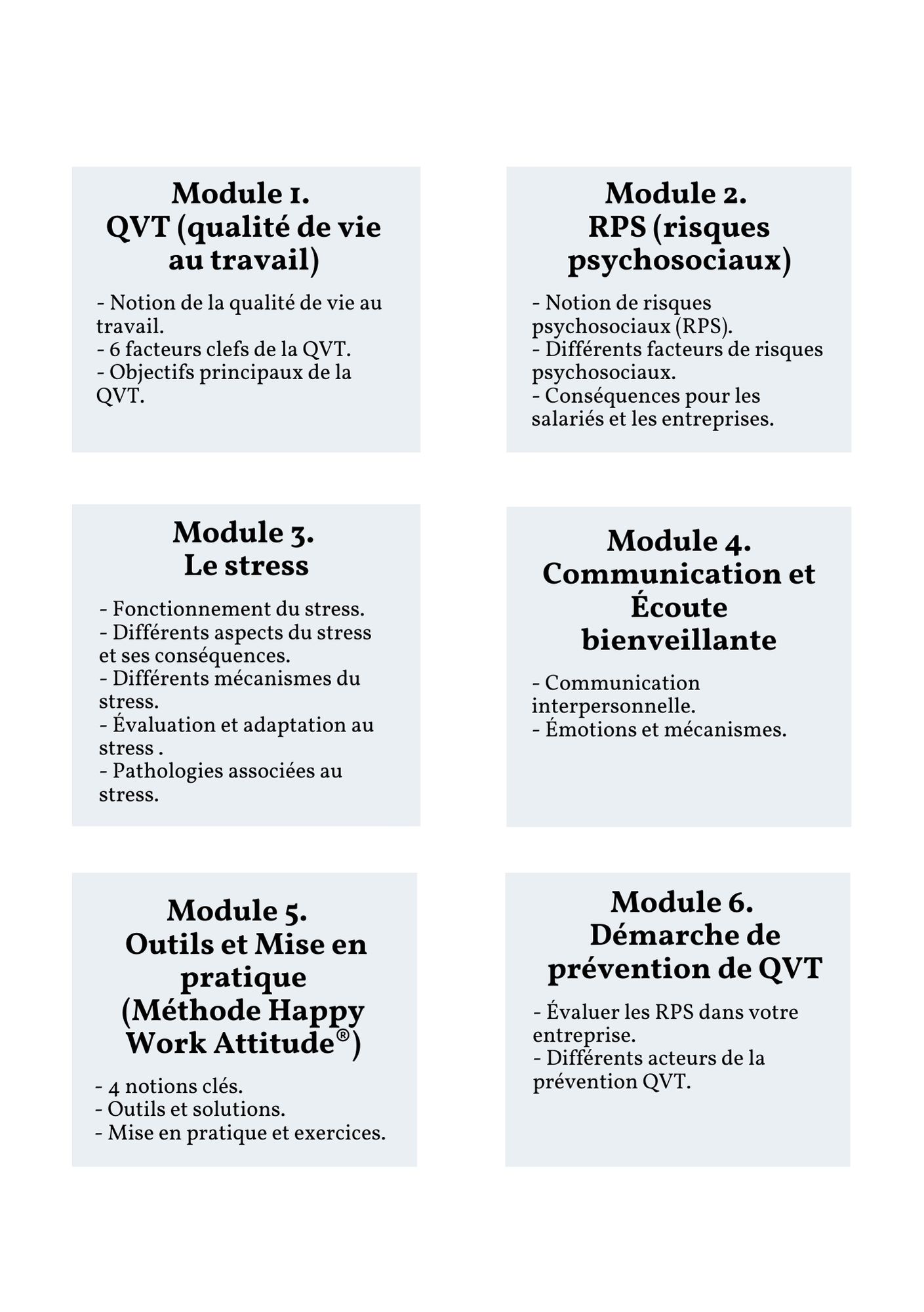 - Agir, intervenir et former sur la prévention des risques psychosociaux, la gestion du stress limitant les tensions néfastes à la santé, prévenir d’éventuels risques concernant le bien-être des collaborateurs en milieu professionnel,