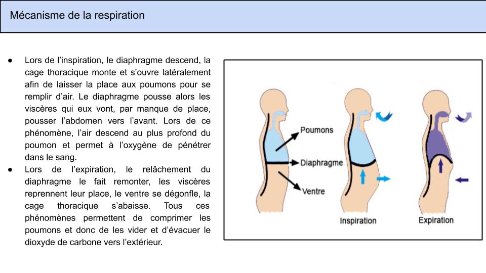 - Lors de l'inspiration, le diaphragme descend, la cage thoracique monte et s'ouvre latéralement afin de laisser la place aux poumons pour se remplir d'air. Le diaphragme pousse alors les viscères qui eux vont, par manque de place, pousser l'abdomen vers l'avant. Lors de ce phénomène, l'air descend au plus profond du poumon et permet à l'oxygène de pénétrer dans le sang.