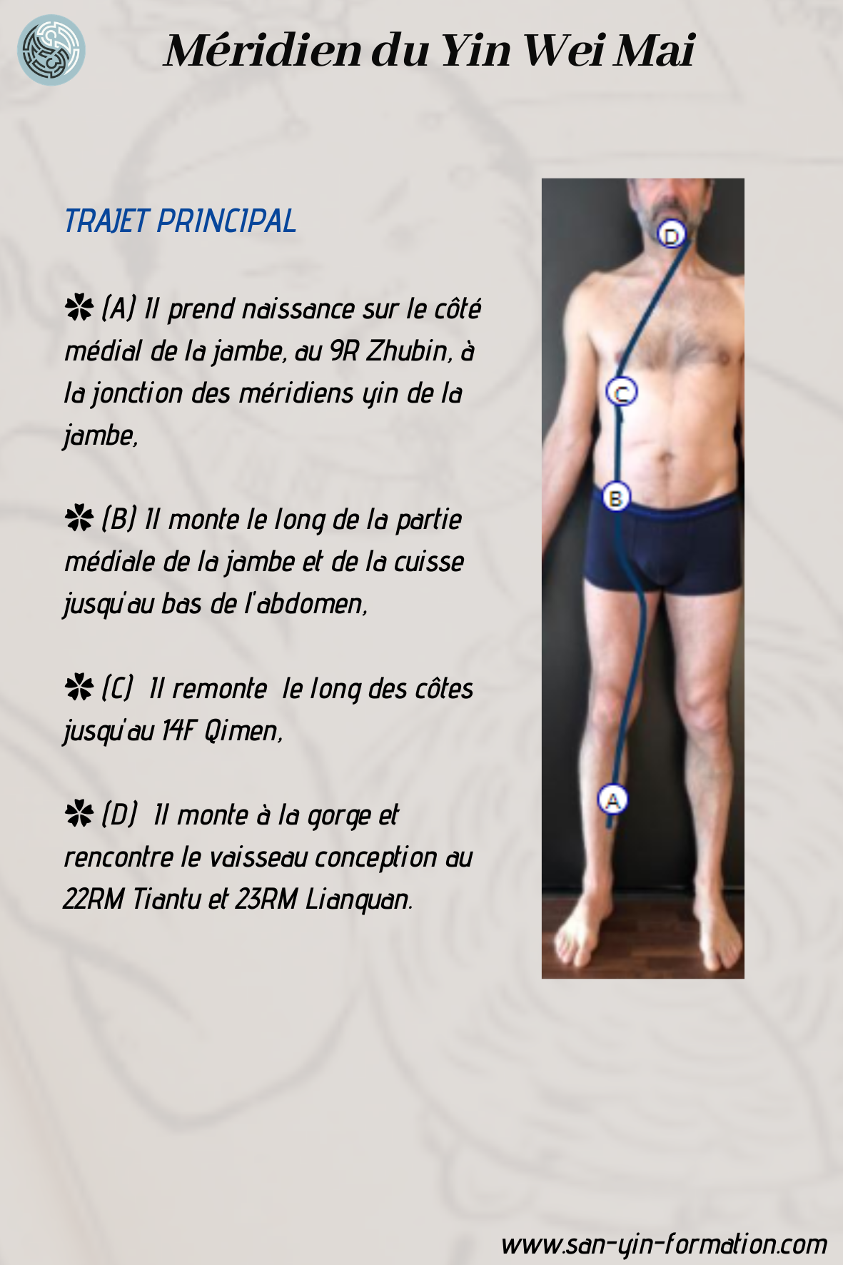 Ce méridien est unique en ce sens qu'il n'est pas associé à un organe spécifique, mais plutôt à la régulation des fonctions corporelles. Il est divisé en trois parties : supérieur, moyen et inférieur, correspondant respectivement à la respiration, à la digestion et à l'élimination. Les déséquilibres dans ce méridien peuvent entraîner divers problèmes de santé.