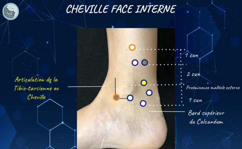 Les repères osseux utiles pour le repérage des points sont : Pointe de la Malléole Interne (bas), Sommet le plus saillant de la Malléole Interne, l'Os Calcanéum (os du Talon : partie supérieure) et bord postérieur du Tibia.